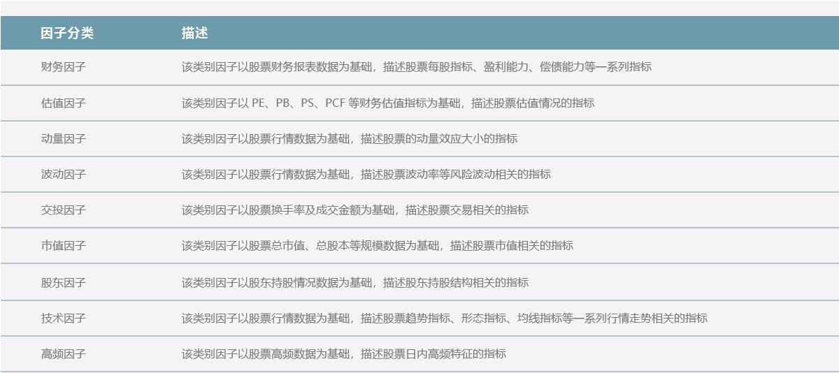 因子数据目前包含有股票品种因子,当前推出股票因子 445个,包含有财务因子等等共9类因子,更多其他品种因子陆续上线中。